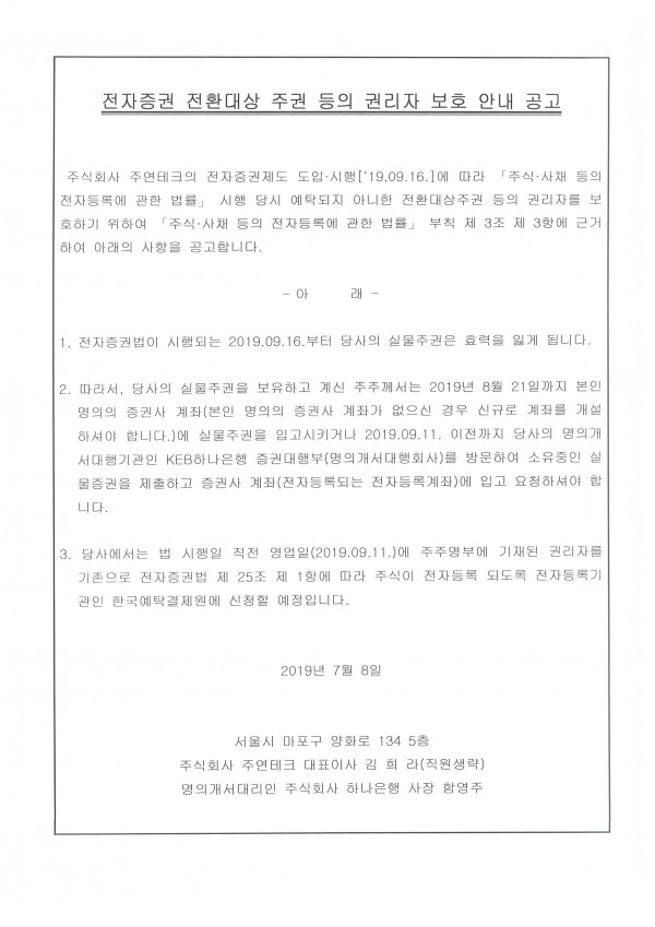 전자증권 전환대상 주권 등의 권리자 보호안내 공고 페이지 정보 작성자 공시담당자 작성일19-07-08 14:13 조회15,395회 댓글0건 관련링크 본문 전자증권 전환대상 주권 등의 권리자 보호안내 공고 이전글 다음글 목록