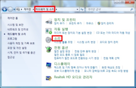 2. 시작 -> 제어판 -> 하드웨어 및 소리 -> 소리 -> 오디오 장치 관리